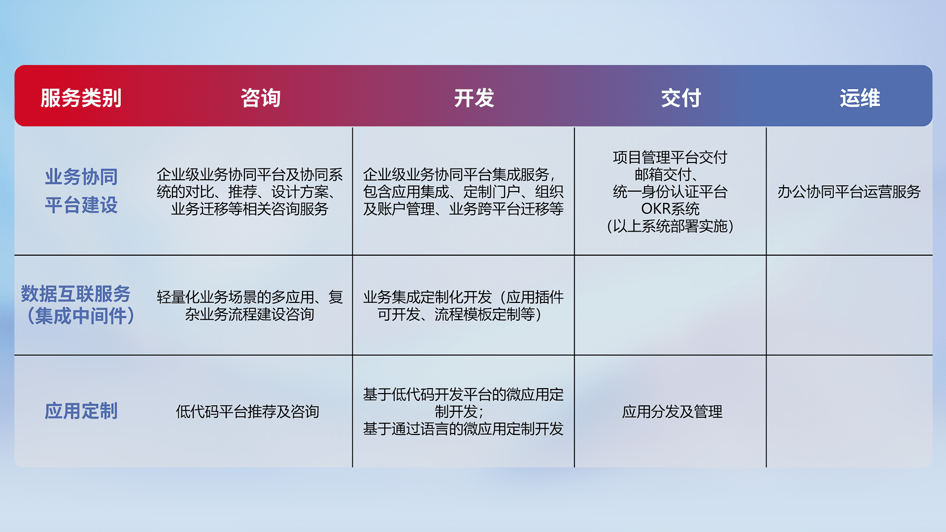 针对钉钉、、、企微、、、、IDaas等平台级产品提供产品的规划、、、、方案、、交付、、、定制化开发等服务,,,实现如统一协同办公、、智能客户服务、、、、混合会议管理、、、智能数据查询、、等业务场景,,实现数字化转型。。。