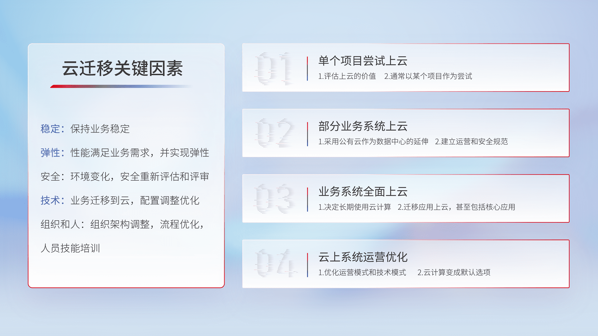 结合实际业务,,,从规划设计、、云平台选型、、、、云原生改造、、、数据迁移、、集成交付,,迁移全过程为客户识别最佳上云路径,,,,做好风险识别管理,,,,设计网络架构、、、身份权限、、、安全审计合规、、、操作审计、、、日志审计、、、、监控告警策略、、、多站点容灾设计等,,对云上基础设施进行整体规划,,提升IT治理水平,,以满足弹性、、、高可用、、、、高性能的需求。。。。