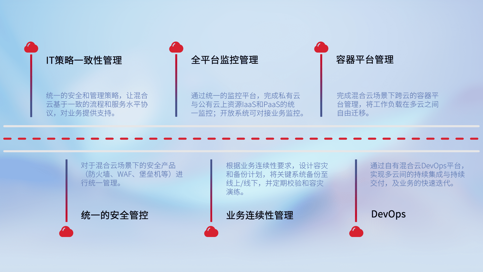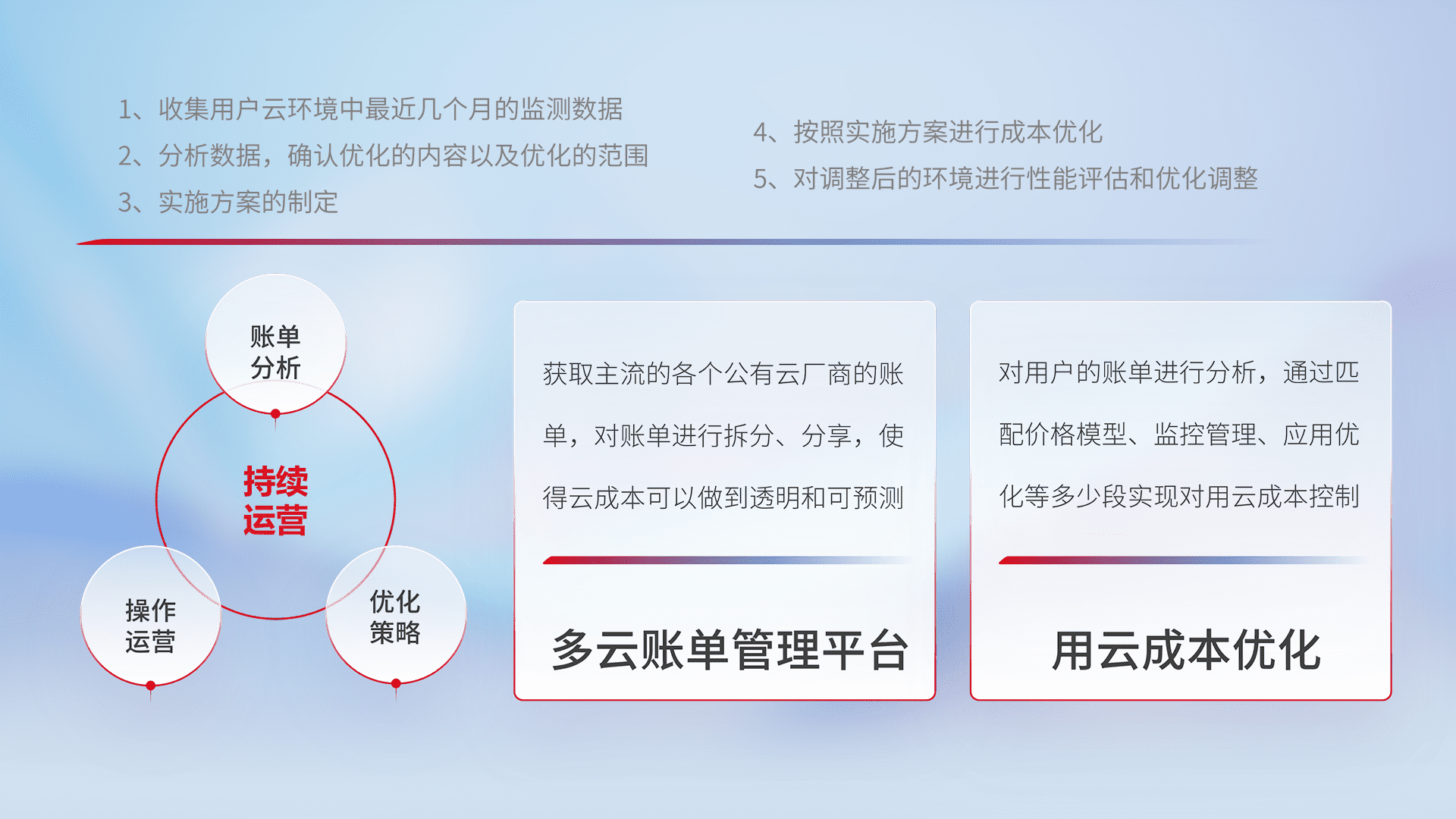 通过多云纳管,,,,以统一的资源数据模型把客户的云资源进行抽象和封装,,,进而实现对多云资源的统一操作,,保障云资源管理的可靠性、、、、稳定性与可用性。。。。量身定制化运维内容,,,,配置、、开发运维、、、、补丁管理、、备份、、、监控、、认证和访问管理、、审计和日常巡检等,,保障在用云过程中的可靠度,,,稳定度以及高可用率。。
